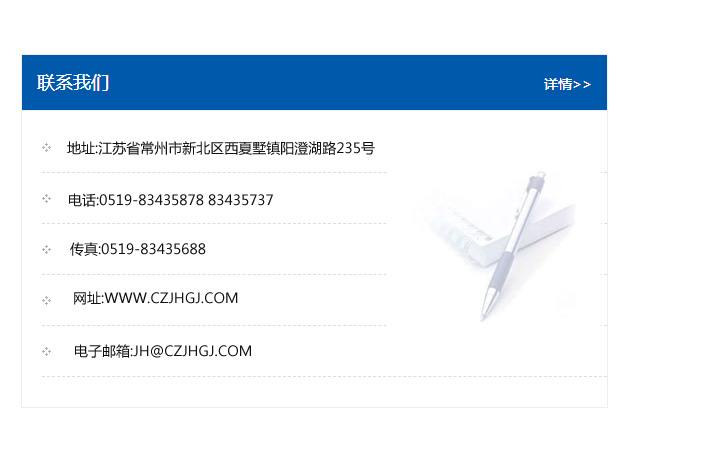 地址:常州市新北區友邦商務大廈1幢16、17層  電話:0519-85101652  傳真:0519-85112595  郵編:213022  網址:www.cz-jiayue_cn.xzyuhuayuan.com  郵箱:xiajifengaa@163.com